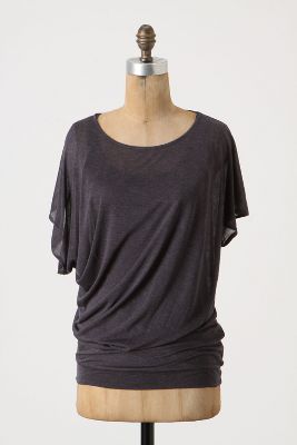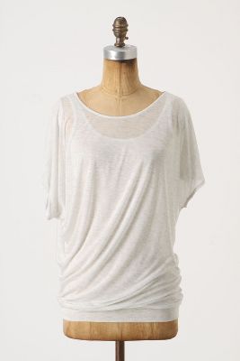 Here is Bordeaux's Drapey Bubbled Tee. I would say this runs a bit small. I'm wearing an XS here but could easily size up to a Small to give myself more length and so it wouldn't be as tight. I love this tee! It's comfortable, lightweight and stretchy. Also, It's not as sheer as you would think and has a layer of material underneath to act as a tank top, as you can see from the photo. I am wearing the Ivory color and in person it seems to be a bit more of a light grey. My younger sister bought this at full price in the Turquoise so I will just be borrowing hers until sale time.