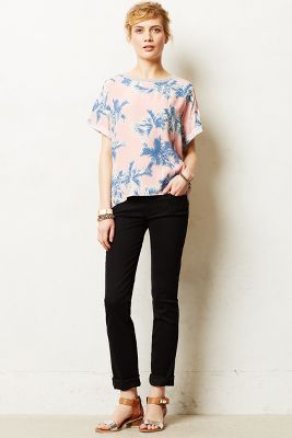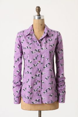 Here is AG's Sateen Stevie and Odille's Tarpan Buttondown. First, the Tarpan Buttondown fits TTS. I'm wearing a size 2. Some might find this to run tight along the shoulders so I would recommend trying your regular size and one size up. I love the vivid purple color, stallion pattern, length and fit. The top is also very comfortable and can be work with jeans, pants and skirts which makes it very versatile.