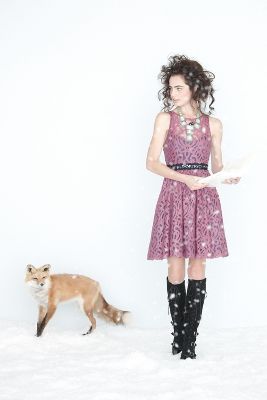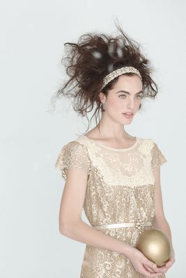 Noisette Lace Dress ($298) with Crystallized Citrine Belt ($48), Plush Stole ($48) and Glitter-Capped Mary-Janes ($158)