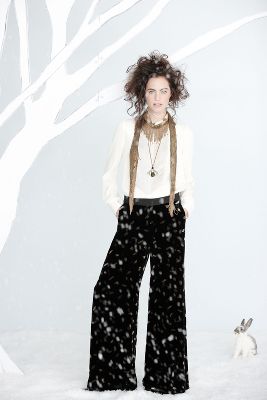 Sequin Tuxedo Buttondown ($168) with Gold-Flecked Velvet Wide-Legs ($178), Gilt Fringe Cocktail Scarf ($58) and Gemmed Flight Necklace ($48)