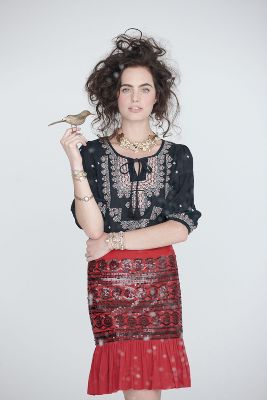 Stitched Medallions Peasant Top ($98) with Sequined Suelta Skirt ($128), Dew Glow Necklace ($278) and Vintage Watchband Bracelet ($118)