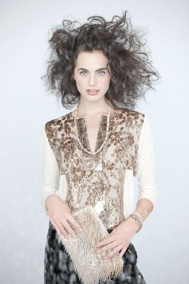 Beaded Altitude Tunic ($178) with Paneled Brushstroke Crops ($128), Margao Collar ($348), Glass Cache Necklace ($598), Giltwork Pin-Fringe Clutch ($78) and Glimmered Brink Mary-Janes ($178)