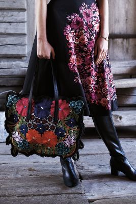 Crystallized Fuchsia Skirt ($158) with Embroidered Lin Shoulder Bag ($188) and Brass-Heeled Knee Boots ($148)