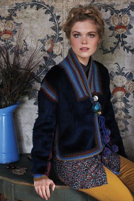 Plum Paisley Coat ($268) with Foxy Sweater Tights ($28), Handpainted Studio Boots ($300) and Crystalline Bug Brooch Set ($48)