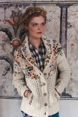 Embroidered Cableknit Cardigan ($198) with Split-Plaid Tunic ($78) and Vintage Watchband Bracelet ($118)